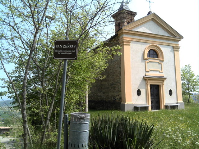 Proseguiamo l’itinerario con una leggera discesa. Arriamo alla chiesetta di San Gervasio. Qui troviamo una palina descrittiva sulla battaglia di Cisterna – Santo Stefano Roero e, poco dopo, sull’Ecomuseo delle Rocche del Roero.